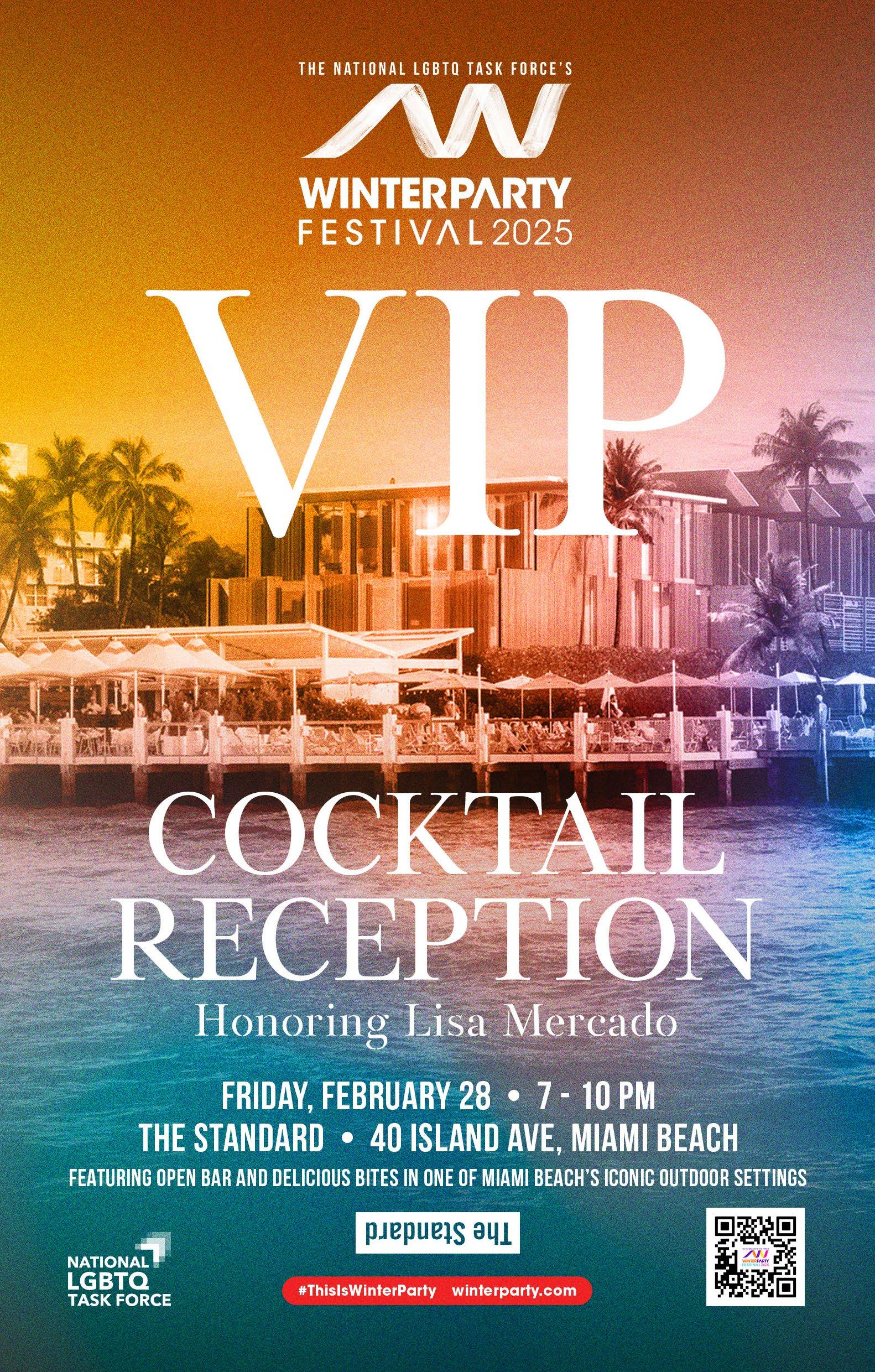 Join us at one of Miami Beach’s most beautiful settings for our annual Winter Party Festival VIP Cocktail Reception. Socialize with the crème de la crème of people in our community -- leaders, celebrities, influencers, and other VIPs -- while you discover more about the National LGBTQ Task Force’s work and impact. This cocktail-style event features an open-bar, special entertainment and remarks by Task Force President Kierra Johnson. We hope you will join us as we honor former Task Force staff member and Winter Party Festival Co-Chair Lisa Mercado, a longtime activist in the South Florida LGBTQ+ community. The VIP Cocktail Reception is truly a magical evening where we are reminded of how important fundraising is for the Task Force and all of the organizations it is currently supporting and those to come in the future. We hope to see you all there dressed to impress and, more importantly, to cause an impact.
