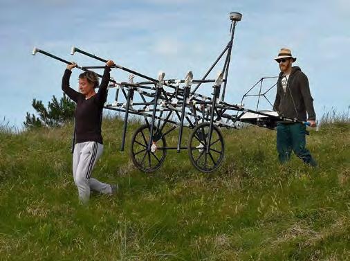 Der mit GPS ausgestattete Wagen und die geophysikalischen Messgeräte auf dem Feld, auf dem das Haus des Schneiders gefunden wurde. In der Ferne kann man die Dünen von Skallingen sehen.