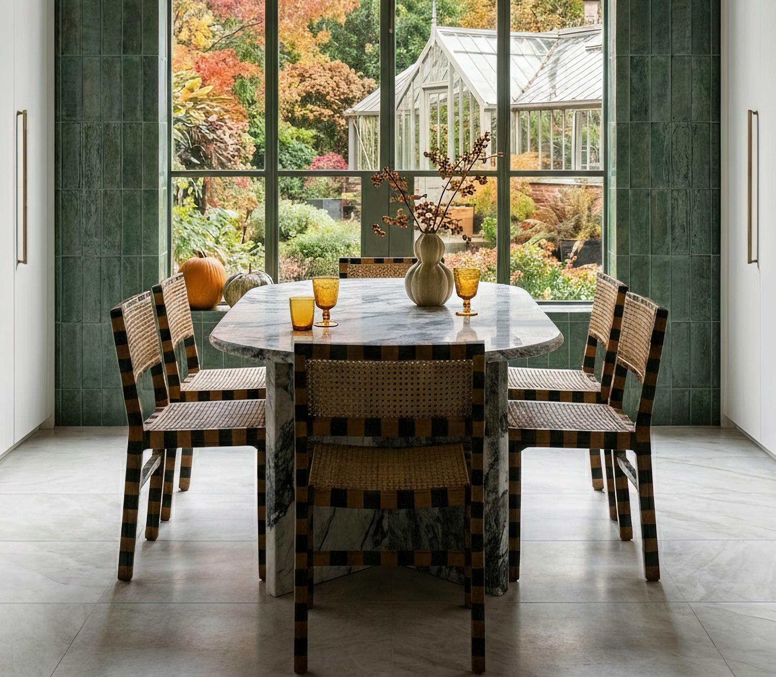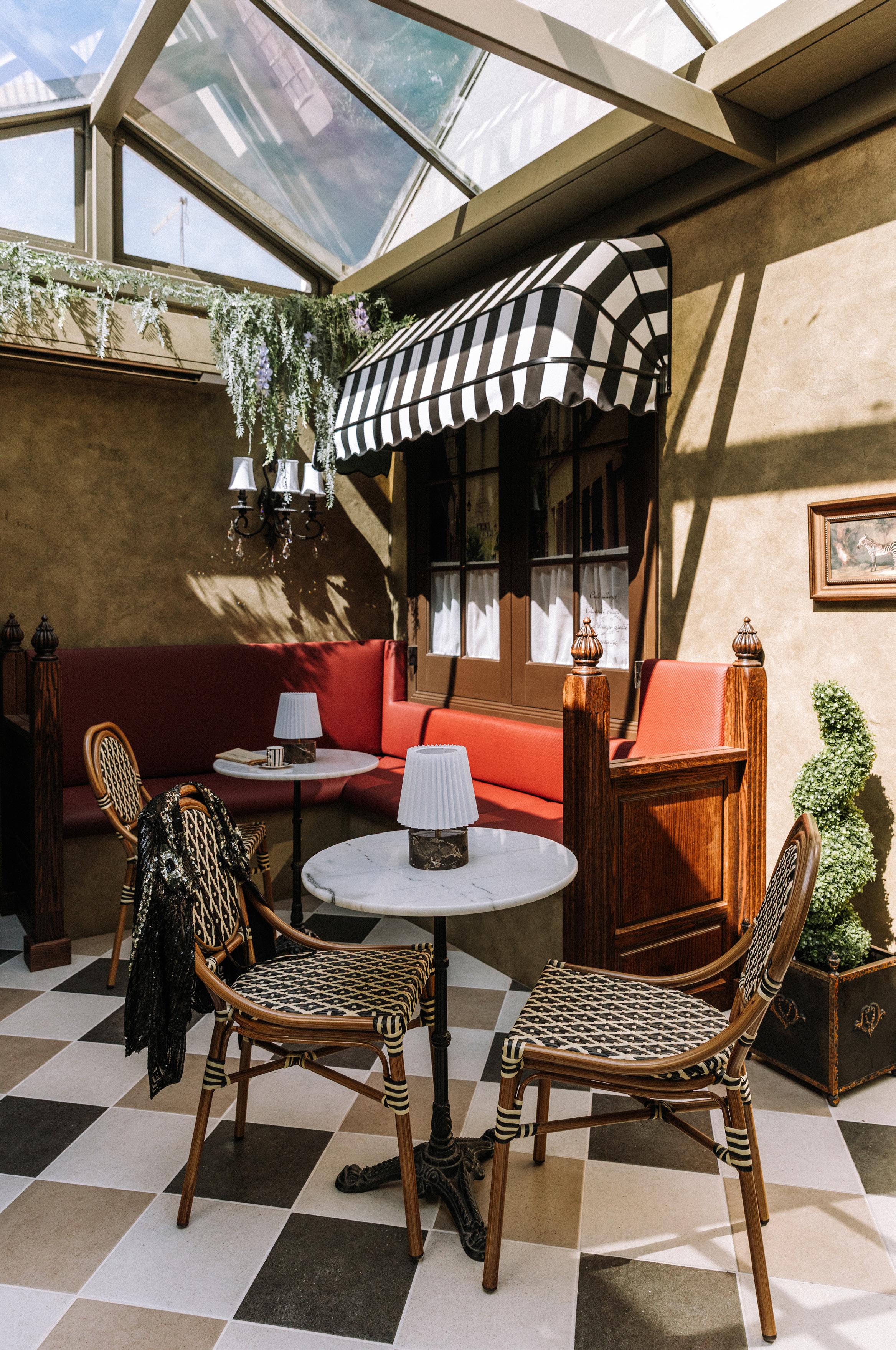 In the Conservatory, we designed a fun three-tone tiled checkerboard floor pattern with a solid border that sits beautifully alongside French-wash walls as shadows dance from the full glass ceiling above. A subtle nod to European streetscapes –playful, elegant and timeless.
