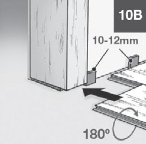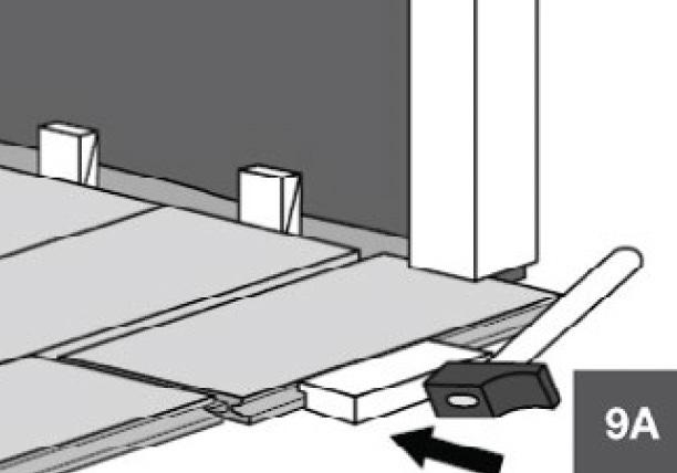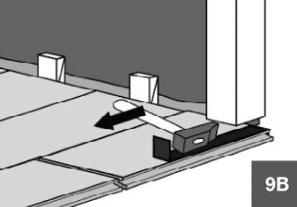 Once the planks have been cut, ensure the expansion joint under the door is at least 10–12mm. If the planks cannot be lifted, gently use a tapping block (9A) or a pull bar and hammer (9B) to tap the planks together while keeping them flat on the floor until they click into place.