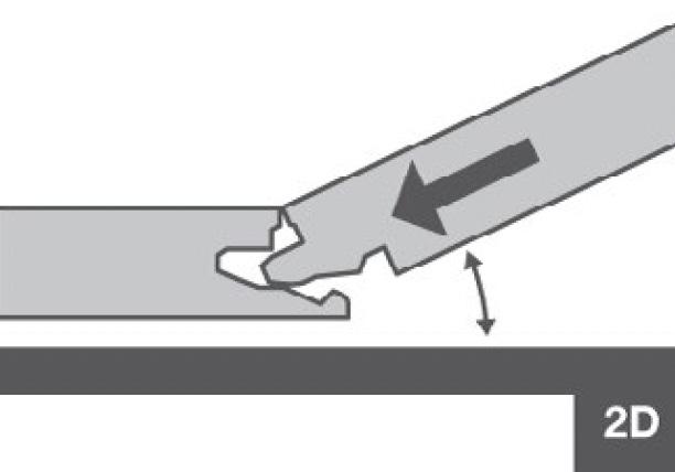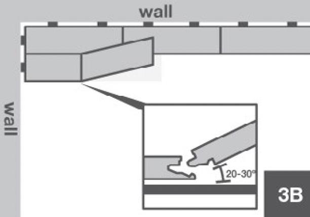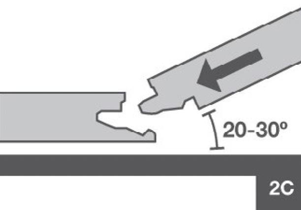 Place the long side of the plank into the first row at an angle of 20–30º; it will automatically click into place. Engage the short-side tongue of the new plank into the groove of the first plank in the second row at a 20–30º angle (3B). Then push the long-side tongue of the new plank at the same angle into the groove of the planks in the first row.