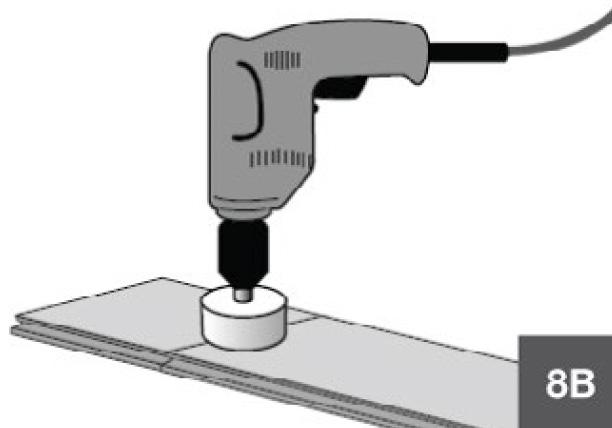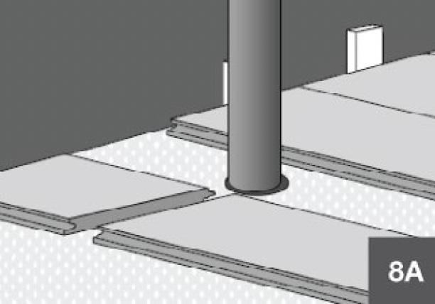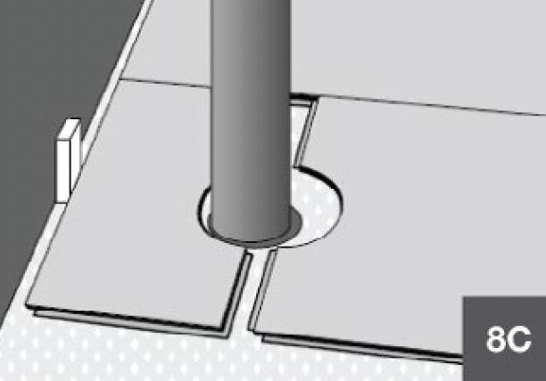 Measure the diameter of the pipe and drill a hole that is 20–24mm larger to allow for expansion. Saw off the cut-out piece, then lay the plank in place on the floor (8A–8C).