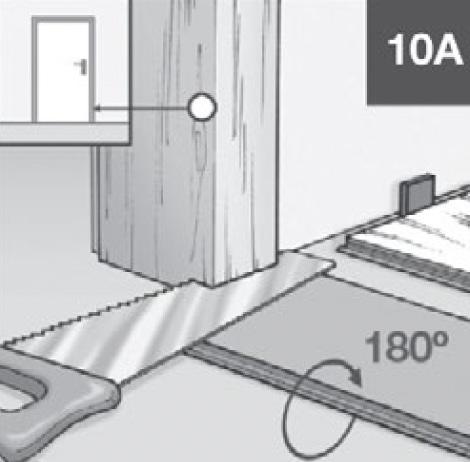 Lay a plank (with the decorative side facing down) next to the door moulding to mark where it needs to be cut, using a jamb saw or a regular handsaw (10A). Cut the plank, then slide it under the moulding (10B).