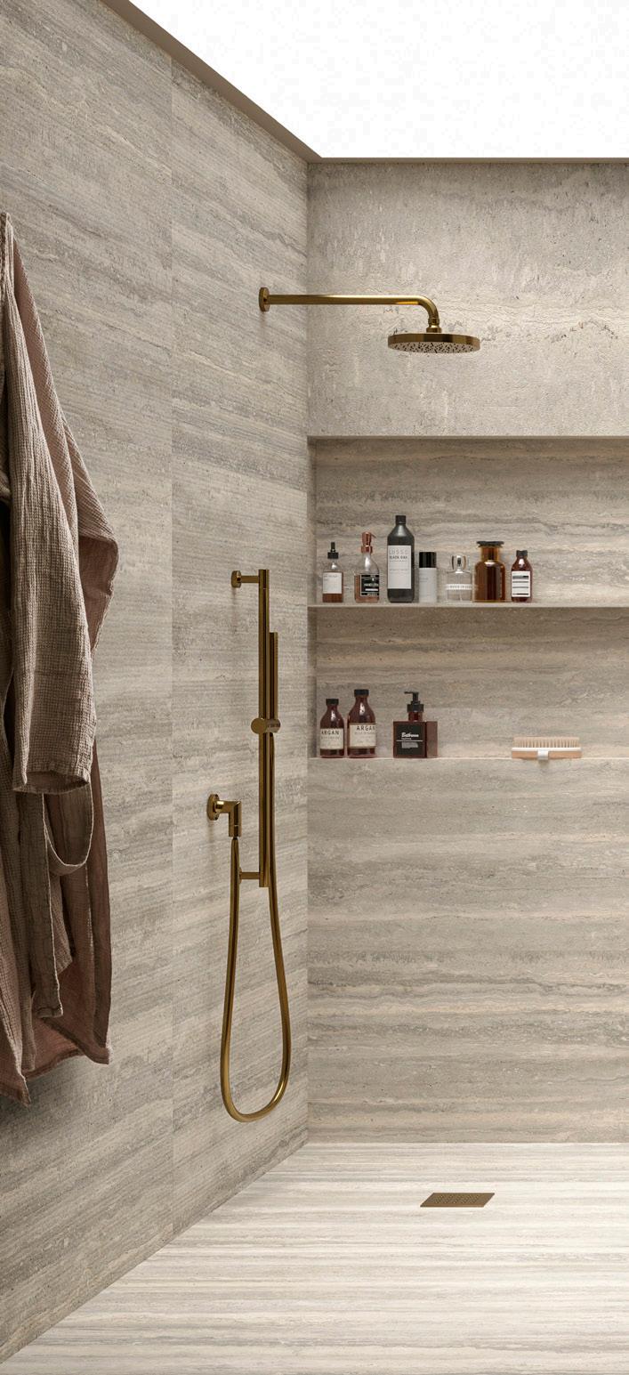 Mystone Travertino is available in three colours. Classico delivers the typical pale beige of traditional travertine; while Navona is a slightly warmer neutral tone. The third option is Silver, a hugely popular hue for today’s modern minimalist look with a delicately striped vibe.