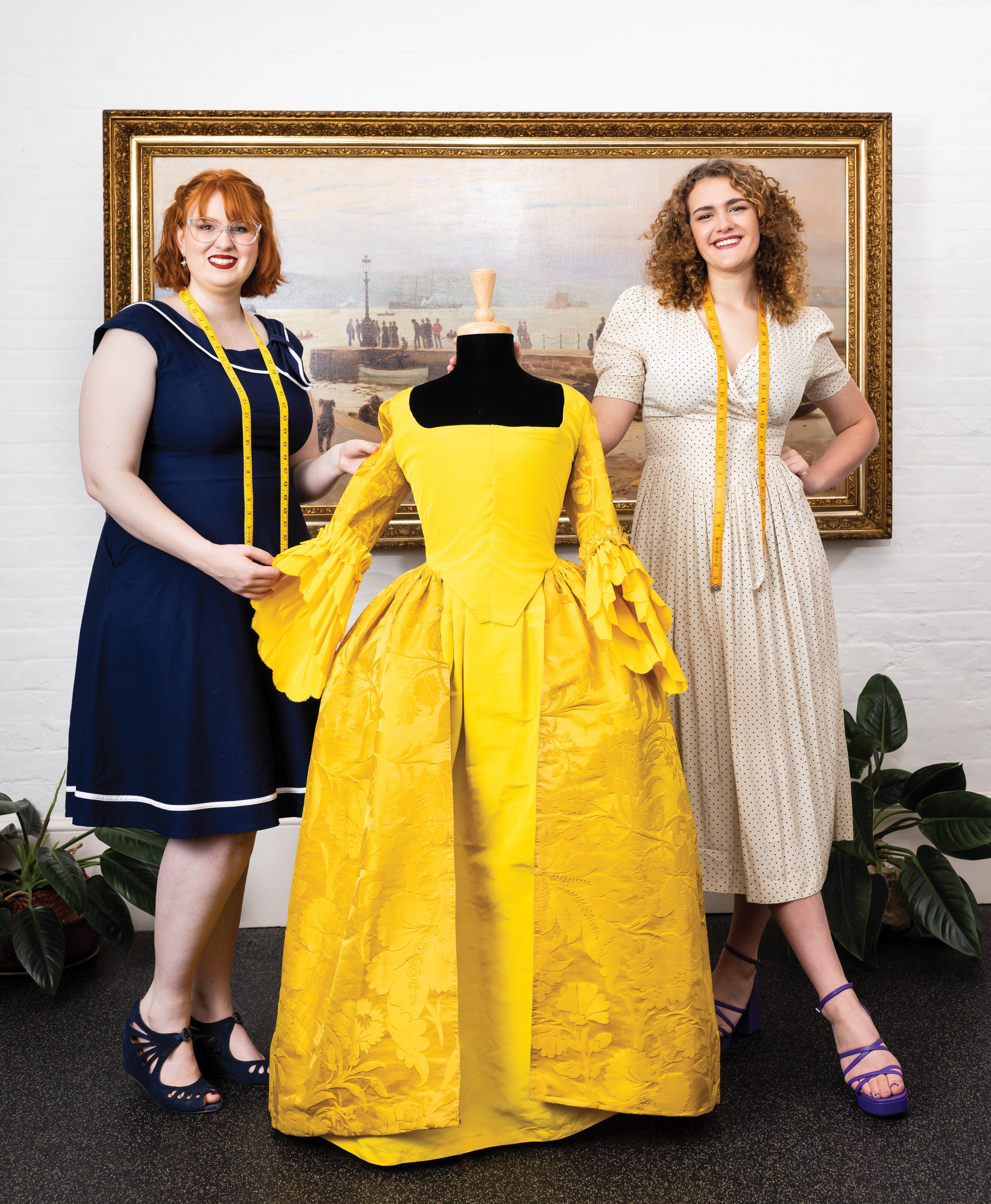National Institute of Dramatic Arts students Lucy Francis (left) and Jasmin Gray with the 1770 version of a dress created from original silk found in the National Trust collection (photo by Jacquie Manning).