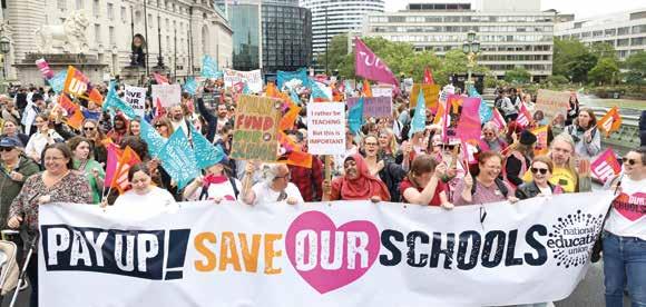CHANTING “Come on, Gill, pay the bill!” and “Our pay’s no higher, Rishi Sunak is a liar!” thousands of members demonstrated in central London on 5 July, the seventh day of strike action. Powered by frustration at Education Secretary Gillian Keegan’s refusal to negotiate on pay since March, and then her failure to publish the School Teachers’ Review Body (STRB) report for two months, members took industrial action at schools across England on 5 and 7 July.