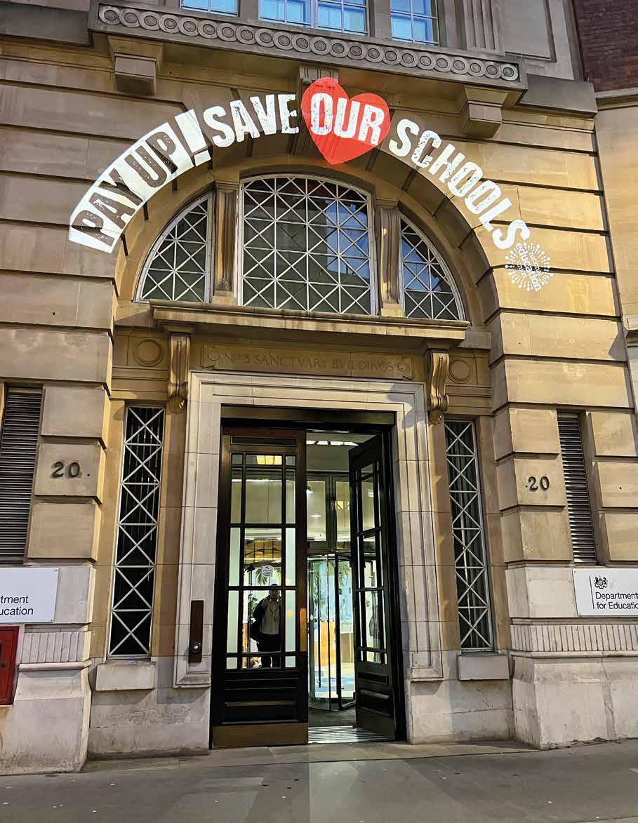 Bigger picture NEU projects Pay Up message onto DfE building.