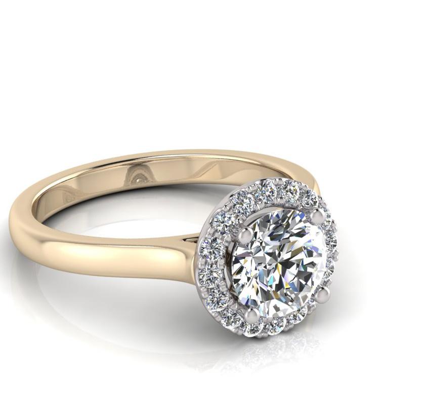 A style of setting that has a centre diamond in a collection of round pavé or micro-pavé diamonds. These pavé stones flash with light and bring the focus to the centre diamond. They are bigger and bolder than the classic solitaire engagement ring, with a vintage feel.