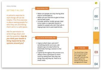 These sample pages show how the toolkits guide facilitators through a series of stages in order to quickly yet robustly produce the assessment..