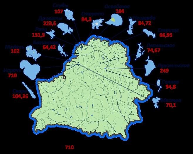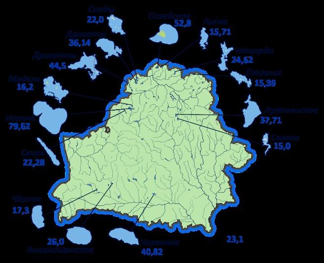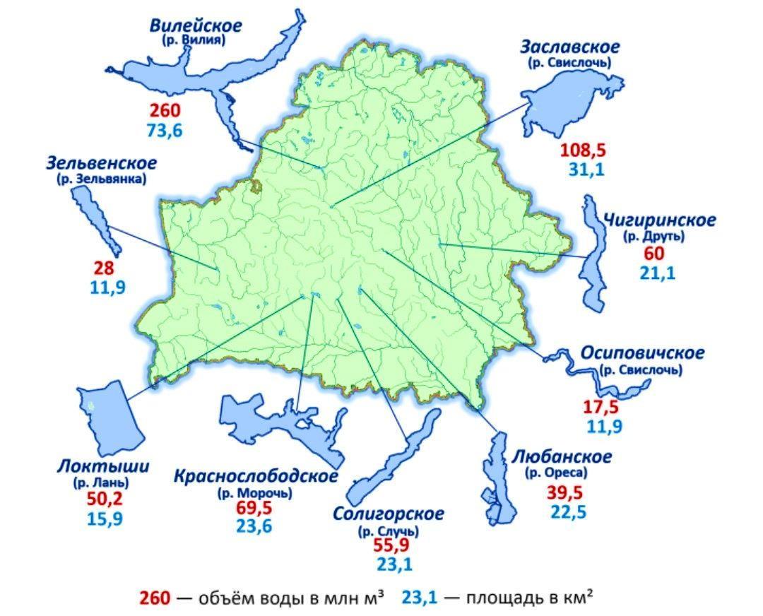 водохранилищ. 16 водохранилищ имеют объём воды более 50 млн м3, самое крупное из них — Вилейское (260 млн м3) . По площади (около 75 км2) оно немногим уступаетозеруНарочь.
