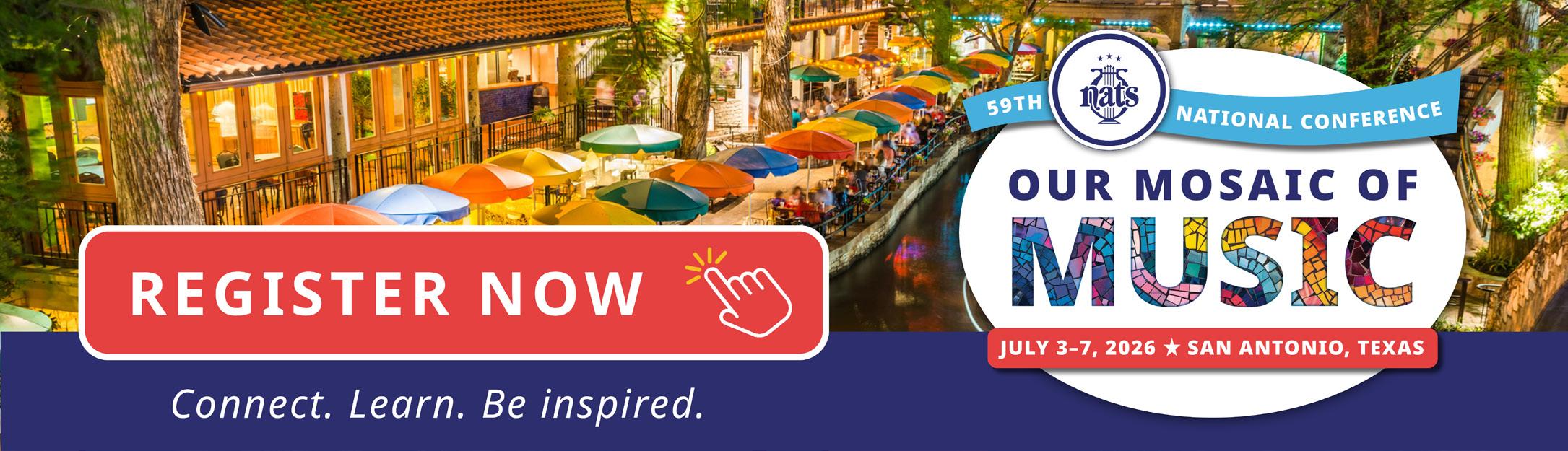 The NATS 59th National Conference will take place July 3-7 in San Antonio, bringing together voice teachers, singers, collaborative pianists, students, and other professionals from across North America and beyond. This biennial gathering features plenary sessions, breakout presentations, performances, and professional networking over five days.
