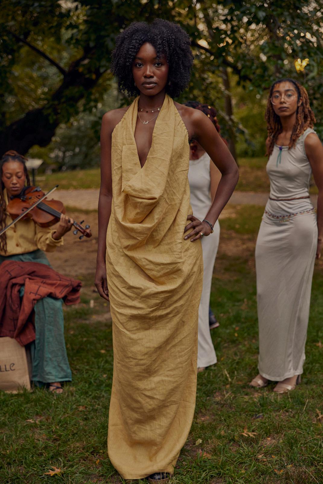Draped halter dress with button closure and gathered back. Shown here in two tone linen color, Muted Sunflower. Retail $695