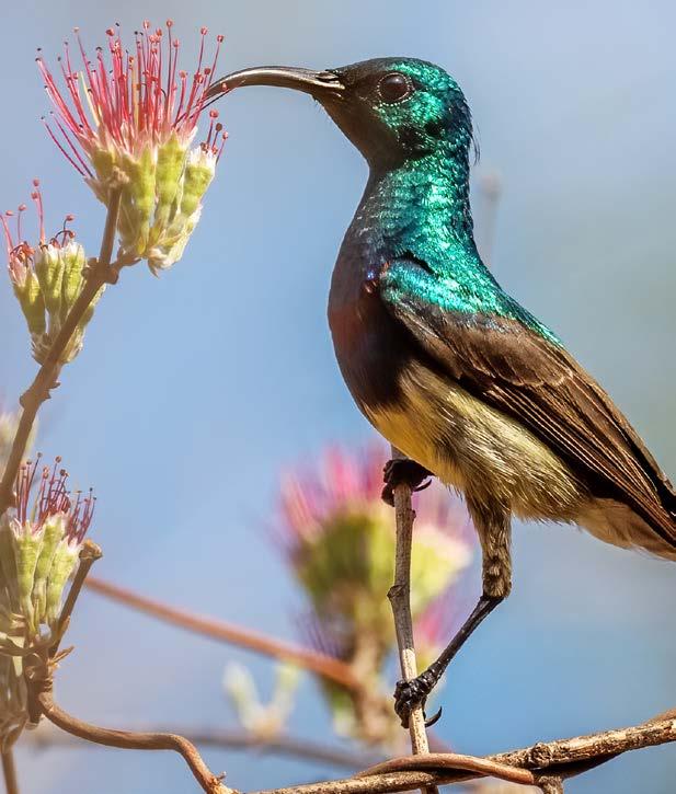 Madagascar’s sunbirds are tiny, iridescent nectar-lovers that brighten the island’s forests, gardens and wetlands. With shimmering plumage and curved beaks, they flit from flower to flower in constant motion. Among the island’s notable species are the souimanga sunbird with its emerald head and long tail streamers, the vibrant Malagasy sunbird and the rare sunbird-asity, which belongs to a unique Malagasy bird family and is especially prized by birdwatchers.