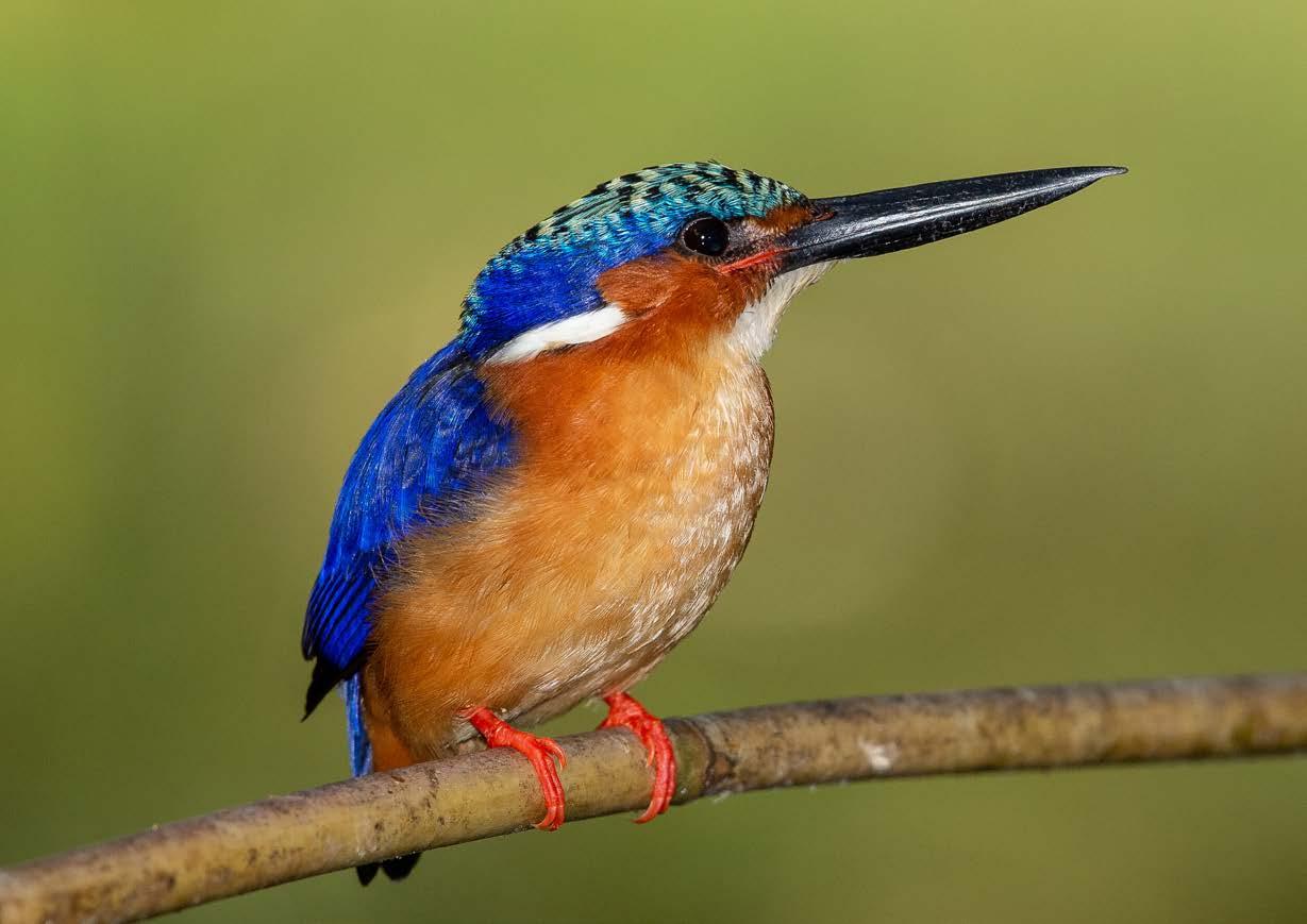 The Malagasy kingfisher is a jewel of Madagascar’s wetlands—no more than five inches long yet unmistakably vibrant, with ultramarine upperparts, a rufous chest and a green-and-black barred crown. Perching above slow-moving water, it plunges swiftly to snatch fish, insects, and small frogs. One of only two kingfisher species on the island, it highlights the unique biodiversity of Madagascar’s aquatic habitats.
