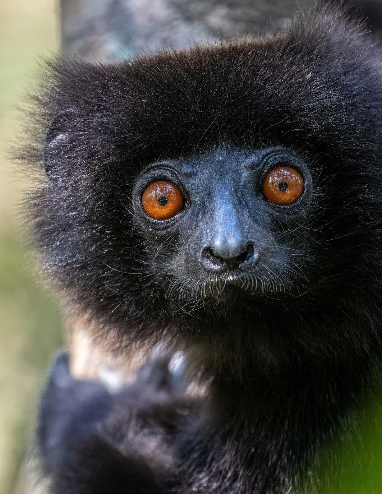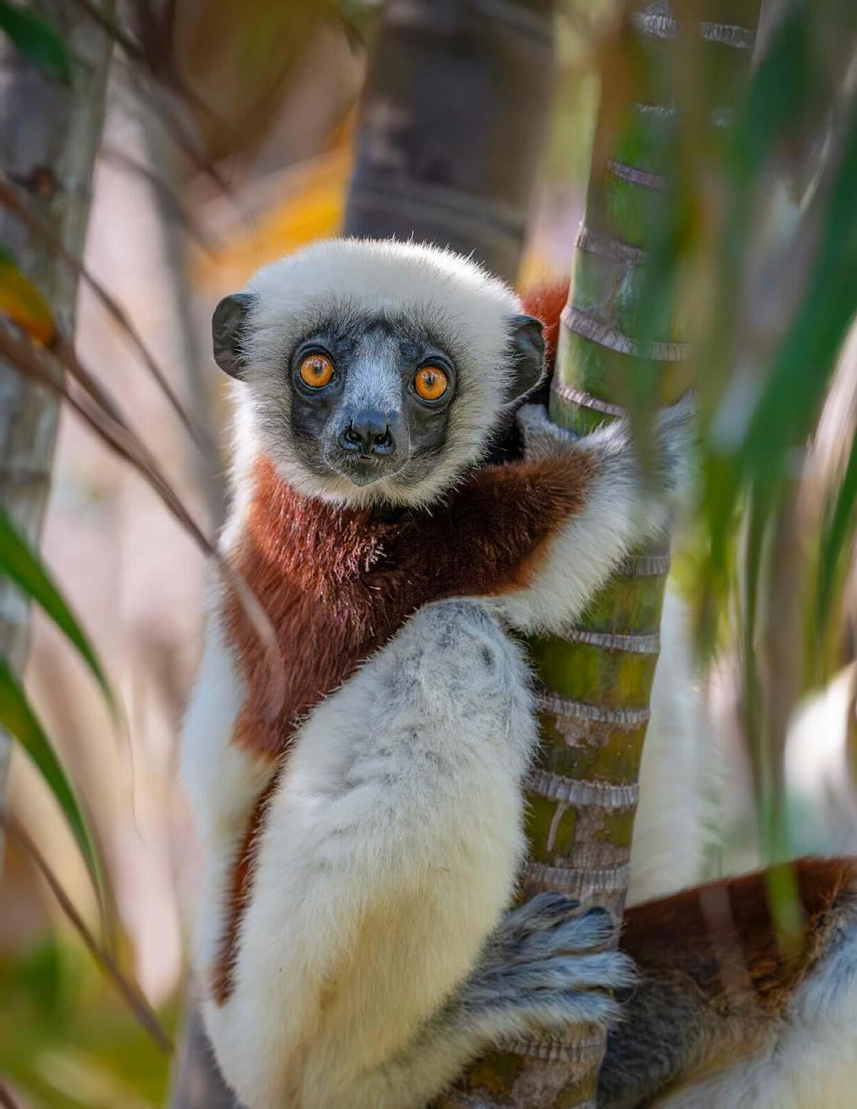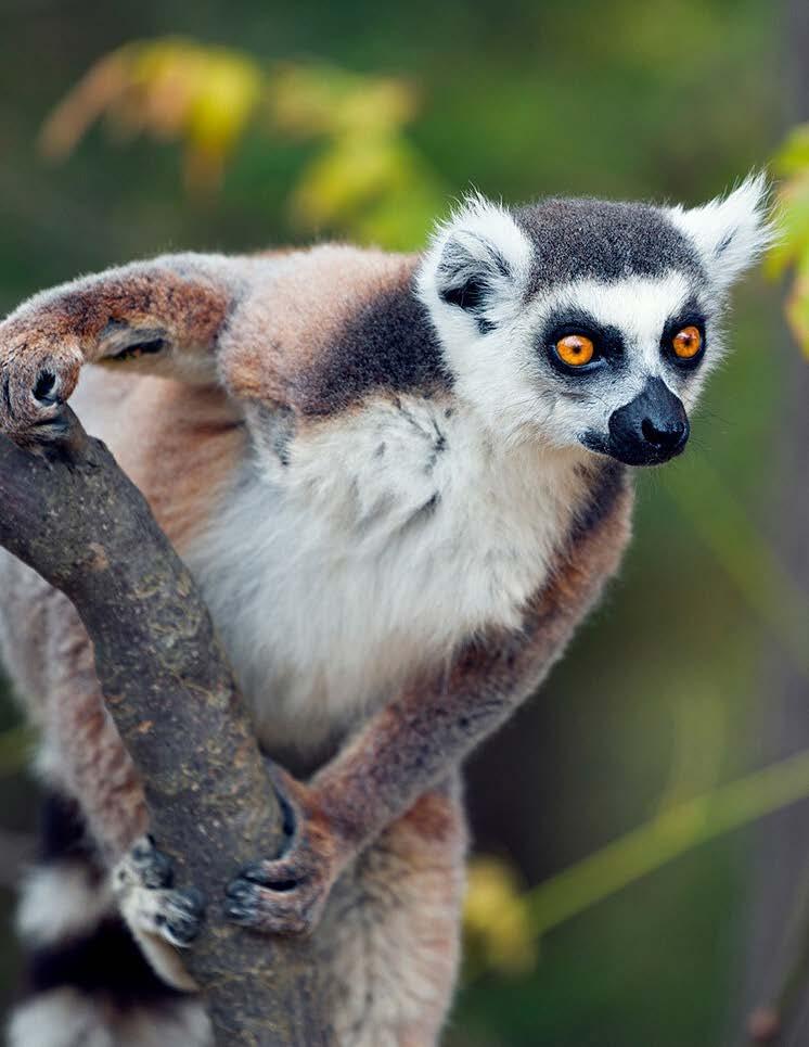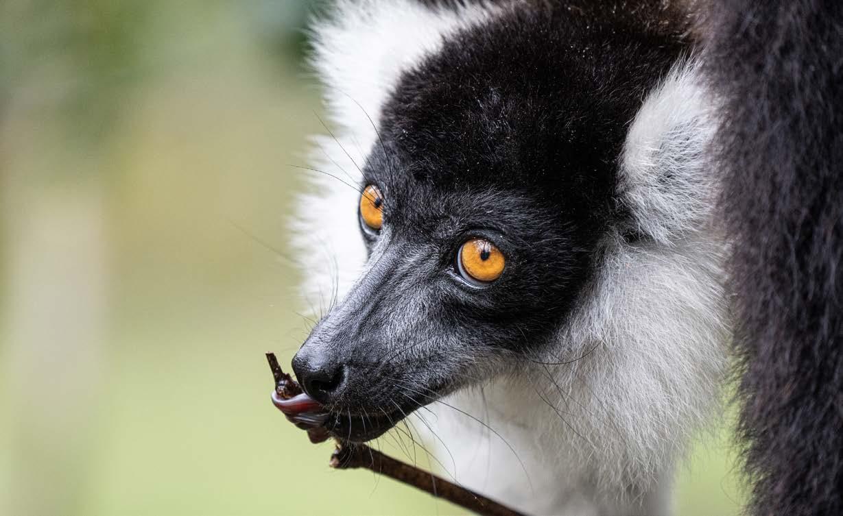 The black-and-white ruffed lemur resides in Madagascar’s eastern rainforests and is one of the largest lemurs alive today, weighing up to 10 pounds. It is distinguished by its dramatic black-and-white coat and loud barking calls. This highly arboreal species thrives in the high canopy, feeds primarily on fruit and nectar and plays a vital role as a key pollinator of tropical trees.