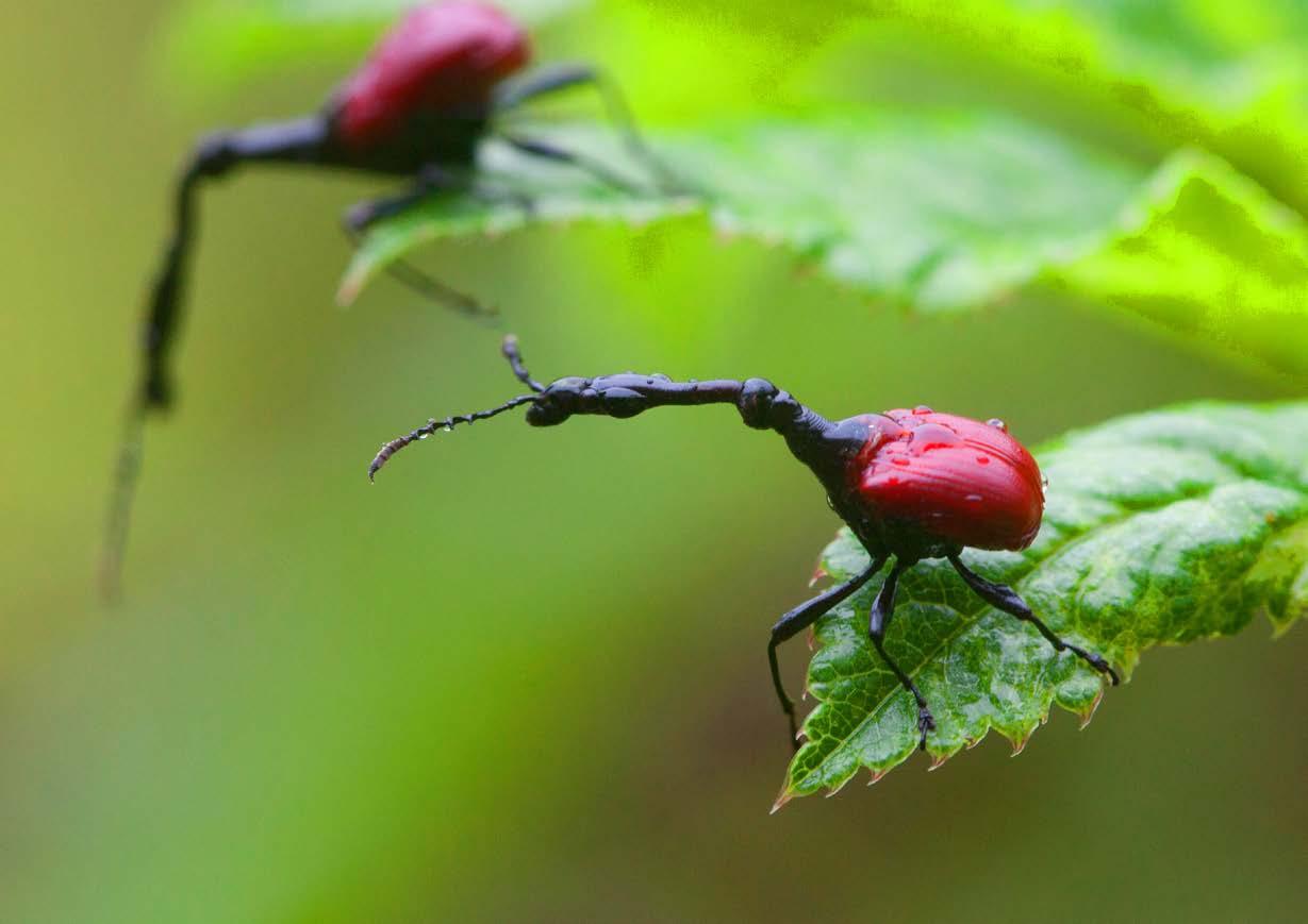 The giraffe-necked weevil is a true Madagascar oddity. Males possess an elongated neck up to three times longer than a female’s, used to duel rivals for mates. Their black bodies sport brilliant red wing covers, and both sexes spend their lives on just two species of melon-shrub trees—feeding, mating and building leaf-tube nests. These unique insects are endemic and exquisitely specialized.