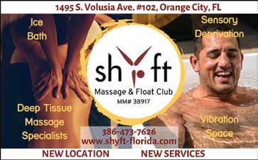 They also offer Massage and monthly community events including Meditation, Breathwork and Awareness Training. Check out the calendar (pg 26) for January 7, 11 & 25. Shyft Massage & Float Spa is located at 1495 S. Volusia Ave, #102 in Orange City. Call 386-473-7626 or more info: www.shyft-florida.com
