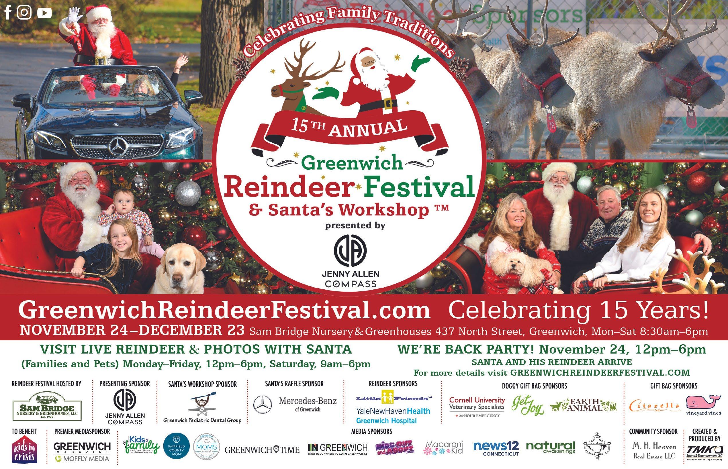Santa and his three live reindeer return to Greenwich for the 17th Annual Greenwich Reindeer Festival & Santa’s Workshop, presented by Jenny Allen and Kristen Studwell of Compass Real Estate, at Sam Bridge Nursery & Greenhouses, in Greenwich, from November 28 to December 24.