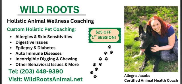 Pet parents in Fairfield and Litchfield counties—and across the nation—now have access to a fresh, holistic approach to pet health through Wild Roots Animal Wellness, founded by Allegra Jacobs, NAVC Pet Nutrition Coach. Her mission is to help pets thrive naturally and make health challenges like digestive issues, skin irritations, allergies, anxiety and behavioral ailments a thing of the past.