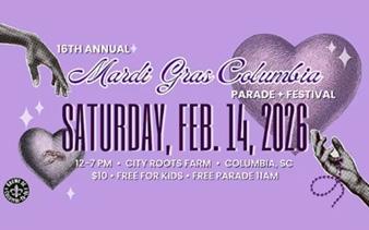 Columbia will host the 16th annual Mardi Gras Parade and Festival on Saturday, February 14, from noon to 7 p.m. at City Roots Urban Farm. The grassroots celebration features live music, Cajun food, a parade and family-friendly activities.