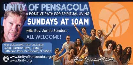 Unity of Pensacola offers spiritual teachings that empower abundant and meaningful living. We provide philosophy that is spiritual, not religious, and love-based, not fear-based. Rev. Jamie Sanders offers spiritual counseling. See ad, page 17.
