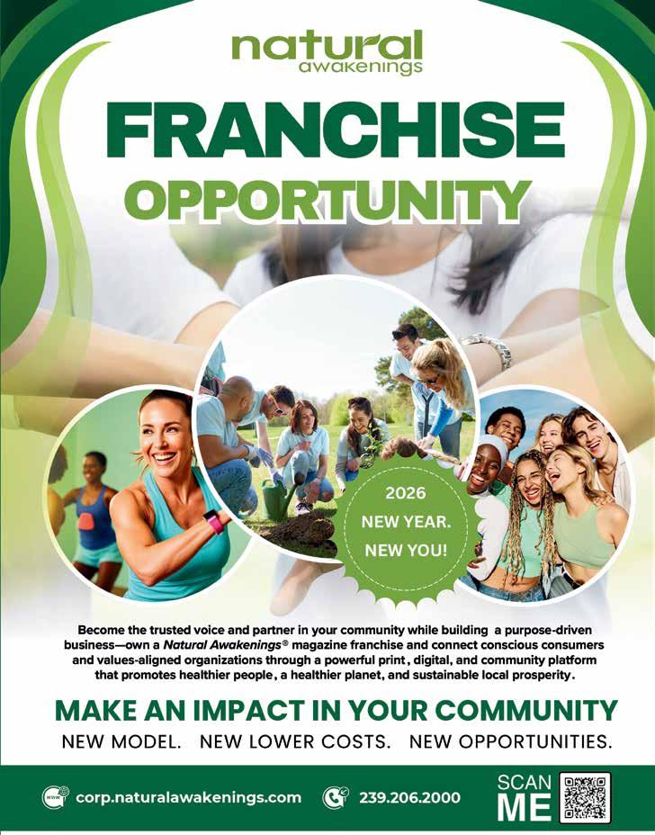 © 2026 by Natural Awakenings. All rights reserved. Although some parts of this publication may be reproduced and reprinted, we require that prior permission be obtained in writing. Natural Awakenings is a free publication distributed locally and is supported by our advertisers. Some content herein may be partially or wholly produced using AI technology. Please call to find a location near you or if you would like copies placed at your business. We do not necessarily endorse the views expressed in the articles and advertisements, nor are we responsible for the products and services advertised. Check with a healthcare professional regarding the appropriate use of any treatment.