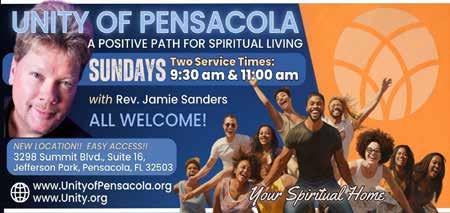 Unity of Pensacola offers spiritual teachings that empower abundant and meaningful living. We provide philosophy that is spiritual, not religious, and love-based, not fear-based. Rev. Jamie Sanders offers spiritual counseling. See ad, page 41.