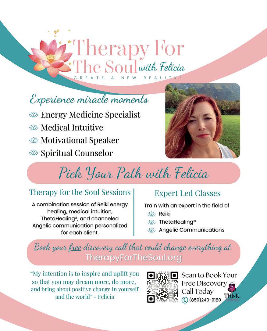 Therapy for the Soul sessions are a combination of Reiki energy healing, medical intuition, ThetaHealing and Channeled Angelic communication customized and personalized for each client. See ad, page 4.