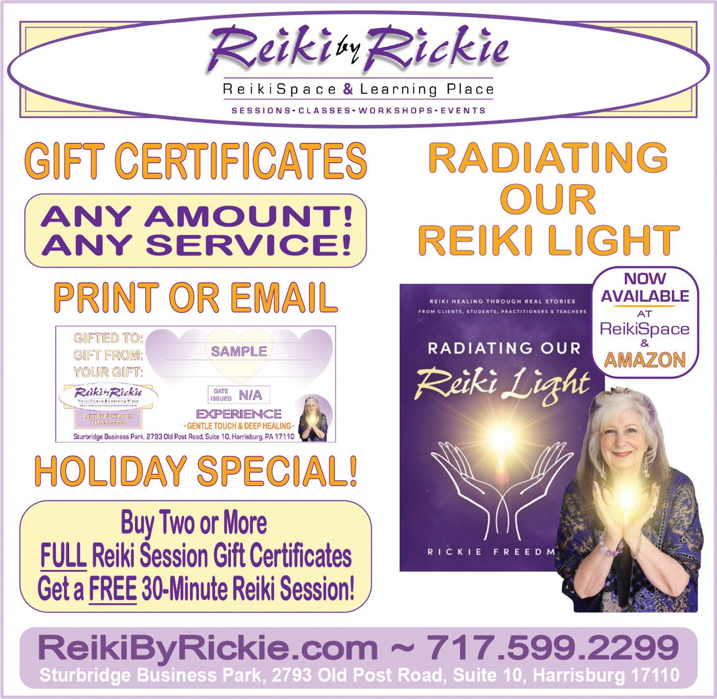 Rickie Freedman, ReikiSpace & Learning Place 2793 Old Post Rd, Ste 10, Harrisburg 717-599-2299 • ReikiByRickie.com