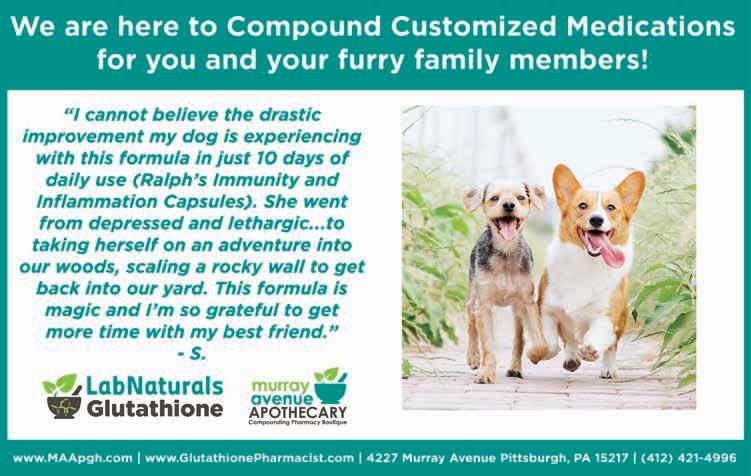 A Compounding Pharmacy Boutique, Pittsburgh's Pet Pharmacy, and home to LabNaturals CBD. We offer holistic health services—hormone balancing and consultation, pharmacist picked supplements, detox, nutritional counseling, absorbable acetylated and palmitated Glutathione products, and pharmacist- compounded CBD products for people and pets. We are a very specialized compounding only pharmacy and we compound anything that is not one-size-fits-all. Check us out online today. See ad, page 11.