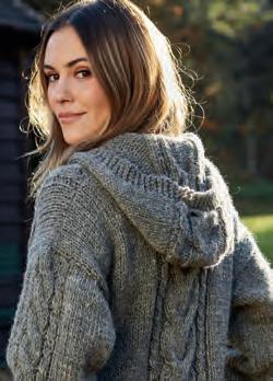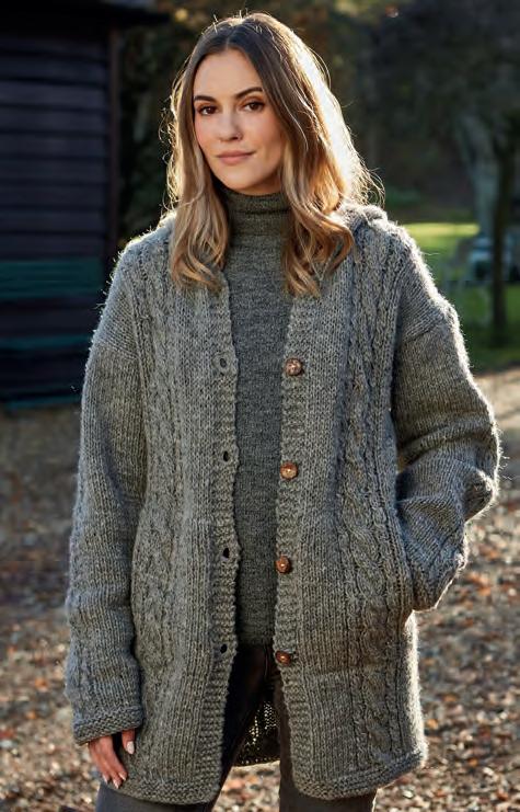 Unlined cable knit hooded cardigan with coconut buttons. Hand knitted in Nepal. 100% wool.