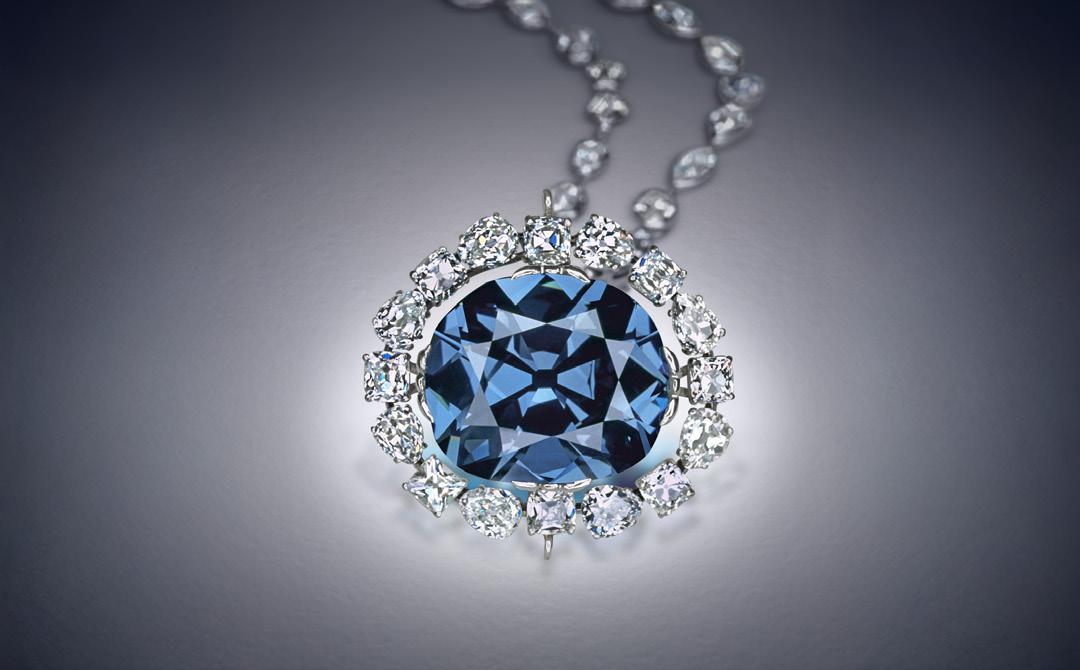 Le diamant Hope51 compte parmi les gemmes les plus mystérieuses et les plus célèbres de l'histoire. Présumé originaire de la mine de Kollur en Inde, il est passé entre les mains des familles royales françaises et britanniques, se forgeant la réputation de porter malheur à ses propriétaires. À l'origine, ce diamant faisait partie du Diamant bleu de la Couronne de France appelé « Bleu de France »52, un diamant de 67 carats appartenant au roi Louis XIV. Il a été volé pendant la Révolution française en 1792 et a ensuite été retaillé pour lui donner sa forme actuelle.
