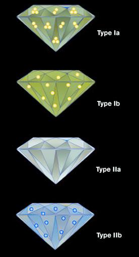 Si l'azote est présent en quantités mesurables, le diamant est de type I, ce qui représente la majeure partie de la production mondiale. Si ce n'est pas le cas, il s'agit du type II, beaucoup plus rare et souvent exceptionnellement pur. Les sous-types Ia, Ib, IIa, IIb sont identifiés en fonction de la disposition des atomes ou de la présence d'autres éléments. Par exemple, le bore donne aux diamants de type IIb leur couleur bleue.