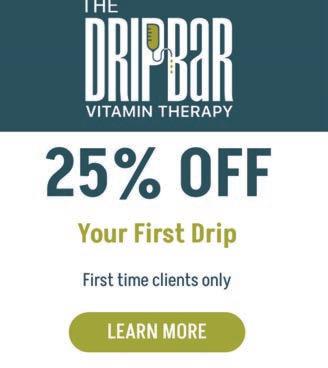 Dave and PJ, co-owners of The DRIPBaR Naples, are the perfect team to provide health and wellness options. As a pharmacist, PJ brings her expertise in compounding to The DRIPBaR Naples. Nick’s role is more business-focused, with experience running multiple companies and seeing the need for this unique community wellness opportunity in Naples. In addition to IV therapy, The DRIPBaR offers services such as IR sauna, halo therapy, red/blue light therapy, and leg compressions. Open seven days a week, The DRIPBaR is located at 11216 Tamiami Trail N. in the Riverchase Shopping Plaza. For more information, call 239.422.6044, email NaplesFL240@thedripbar.com, and visit Naples.thedripbar.com See ad on page 39 >