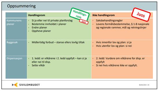 Slik illustrerte seniorrådgiver Åse Bekkevold Kloster i Sivilombudet kommunenes store handlingsrom for politisk skjønn (grønt) i arealforvaltningssaker i en presentasjon for Kragerø kommune 2023:
