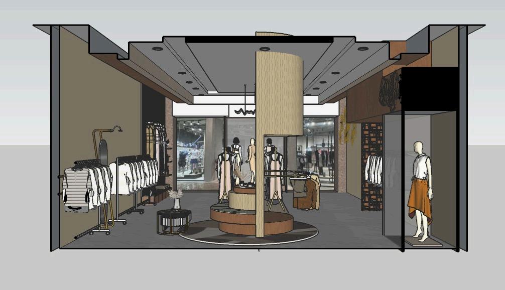 Desain butik ini menyesuaikan brand image yang elegan dengan konsep minimalis tanpa detail berlebihan Gaya simpel namun tetap mewah berpadu dengan deretan koleksi busana di sisi kiri, kanan, dan tengah ruangan