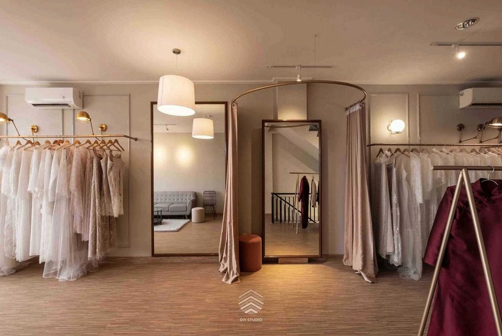 Tersedia dua area fitting: cermin terbuka dan cermin bertirai, keduanya dilengkapi pencahayaan yang baik Warna putih, cream, dan dusty pink menciptakan suasana tenang dan kalem, ditambah sentuhan emas pada rak dan lampu gantung untuk memperkuat kesan mewah. Pencahayaan dibuat lebih redup dan santai, memaksimalkan cahaya alami dari jendela serta dilengkapi pencahayaan buatan berlapis untuk menghadirkan atmosfer nyaman