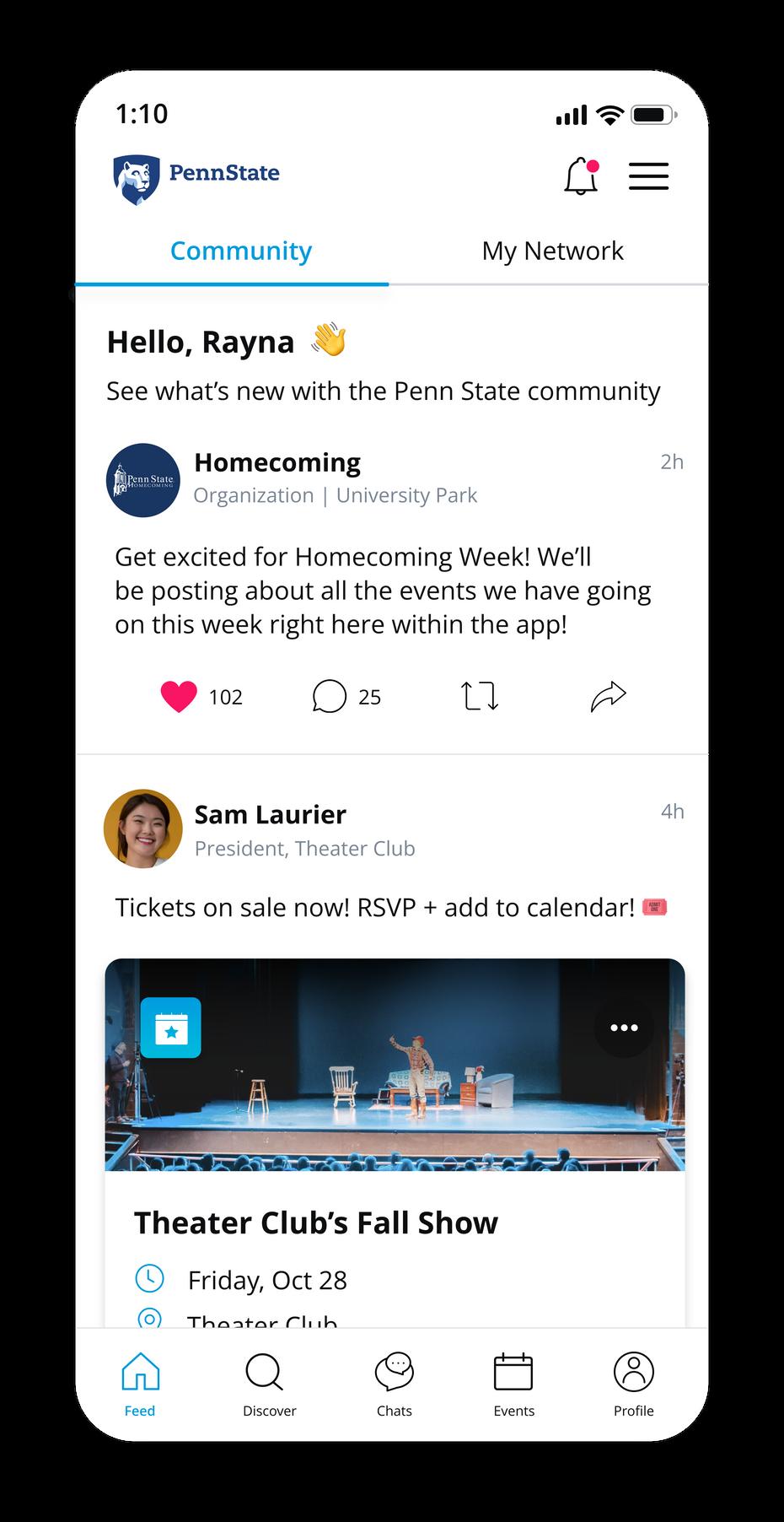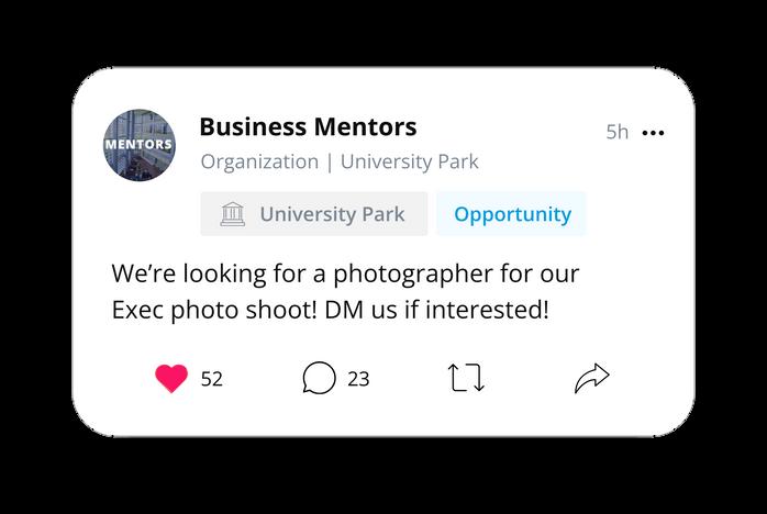 Students, faculty, and staff can grow their networks at Penn State by connecting with each other on the Engagement App. When a connection is made, users can direct message each other, view additional profile information, and see each other's posts on their Network Feeds.