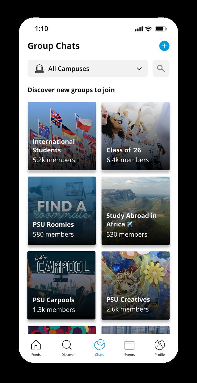 We worked with the College of Engineering to create a "First Year Engineers" group chat. We took all of the first year engineering students from the College, cross-listed it with the existing students who had signed into the Engagement App, and made a group chat for the College to communicate about updates and provide a space for questions. We also auto-added them as followers to the College of Engineering's page on the app, so that the College’s posts showed up in their newsfeeds.
