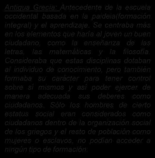 Antigua Roma: introdujo escuela financiada por el estado, obligatoria para ciudadanos, enseñando lectura, escritura, gramática y aritmética. Pensaba que para desarrollar la memoria y la declamación se debía aprender a leer Y escribir a temprana edad, pero a su vez a los niños había que concederle tiempo de juego y descanso, al igual que no había que llegar al castigo físico.