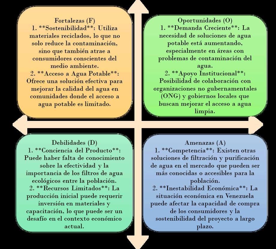 LA MATRIZ FODA AYUDA A IDENTIFICAR LOS ASPECTOS CLAVE QUE PUEDEN INFLUIR EN EL 脡XITO DE LA IMPLEMENTACI脫N DE FILTROS DE AGUA ECOL脫GICOS EN VENEZUELA. APROVECHAR LAS FORTALEZAS Y OPORTUNIDADES MIENTRAS SE GESTIONAN LAS DEBILIDADES Y AMENAZAS SER脕 CRUCIAL PARA EL DESARROLLO Y LA ACEPTACI脫N DEL PRODUCTO EN EL MERCADO.