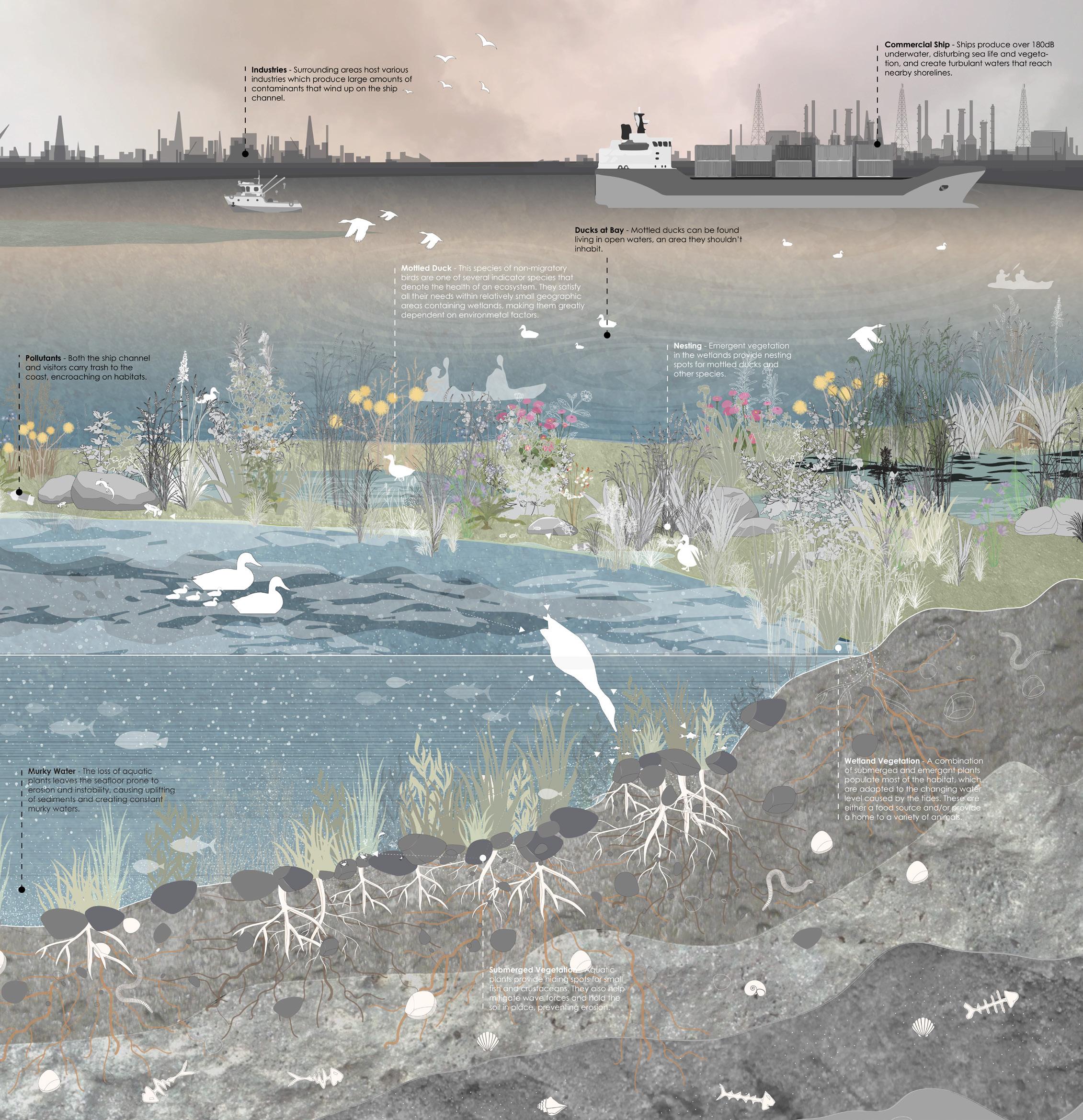 The contamination on the Baytown Peninsula occurs in six phases. The first phase involves land subsidence due to channelization and industrial development, disrupting the natural landscape. In the second phase, flooding and erosion cause the loss of vegetation, leading to turbid water. This degrades water quality and reduces food sources for ducks, forcing them to leave the area.
