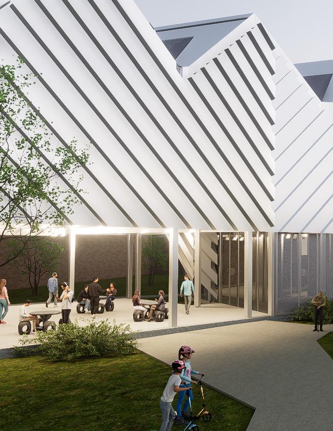 The A.R.C., located at the Harrisburg Art Museum site in the Lockwood Corridor, aims to transform an underused space into a cultural landmark celebrating East End history and local art. The design includes public areas, exhibition halls, classrooms, a coffee shop, and a history exhibit on the ground floor. The second floor features classrooms, artist exhibitions, and an outdoor space with sunlight balance. The third floor houses a library with art books and a small gallery for student art. Sustainable features like solar panels, LED lighting, and rainwater recycling minimize environmental impact. The A.R.C. serves as a hub for culture, education, and artistic expression, connecting the community through art and history.
