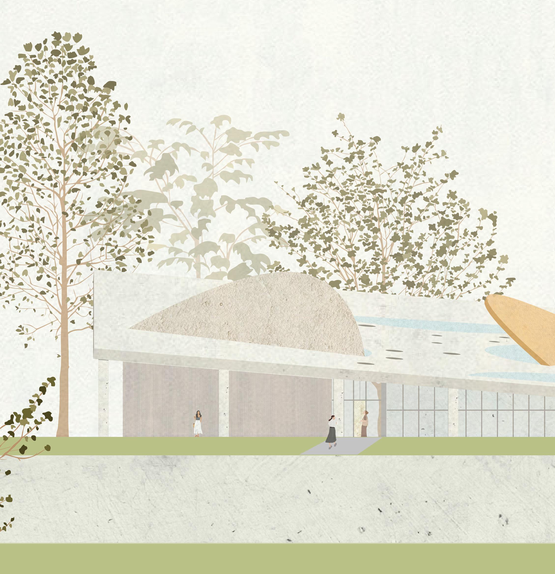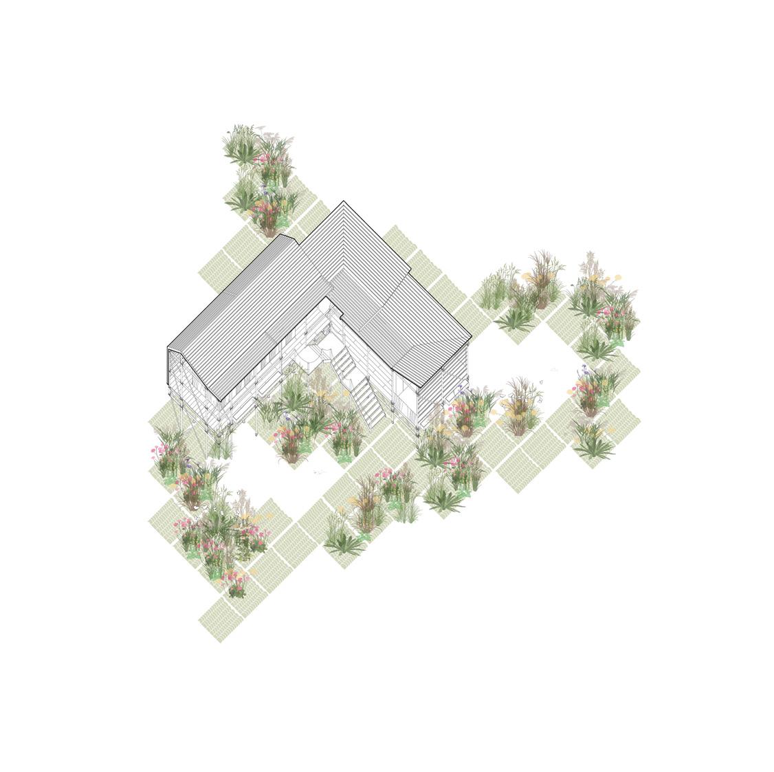 To address flooding concerns, the main programs are located on the second floor. The roof design draws inspiration from the precedent’s angled shape but is made steeper to allow for skylights, providing natural light to the second floor.