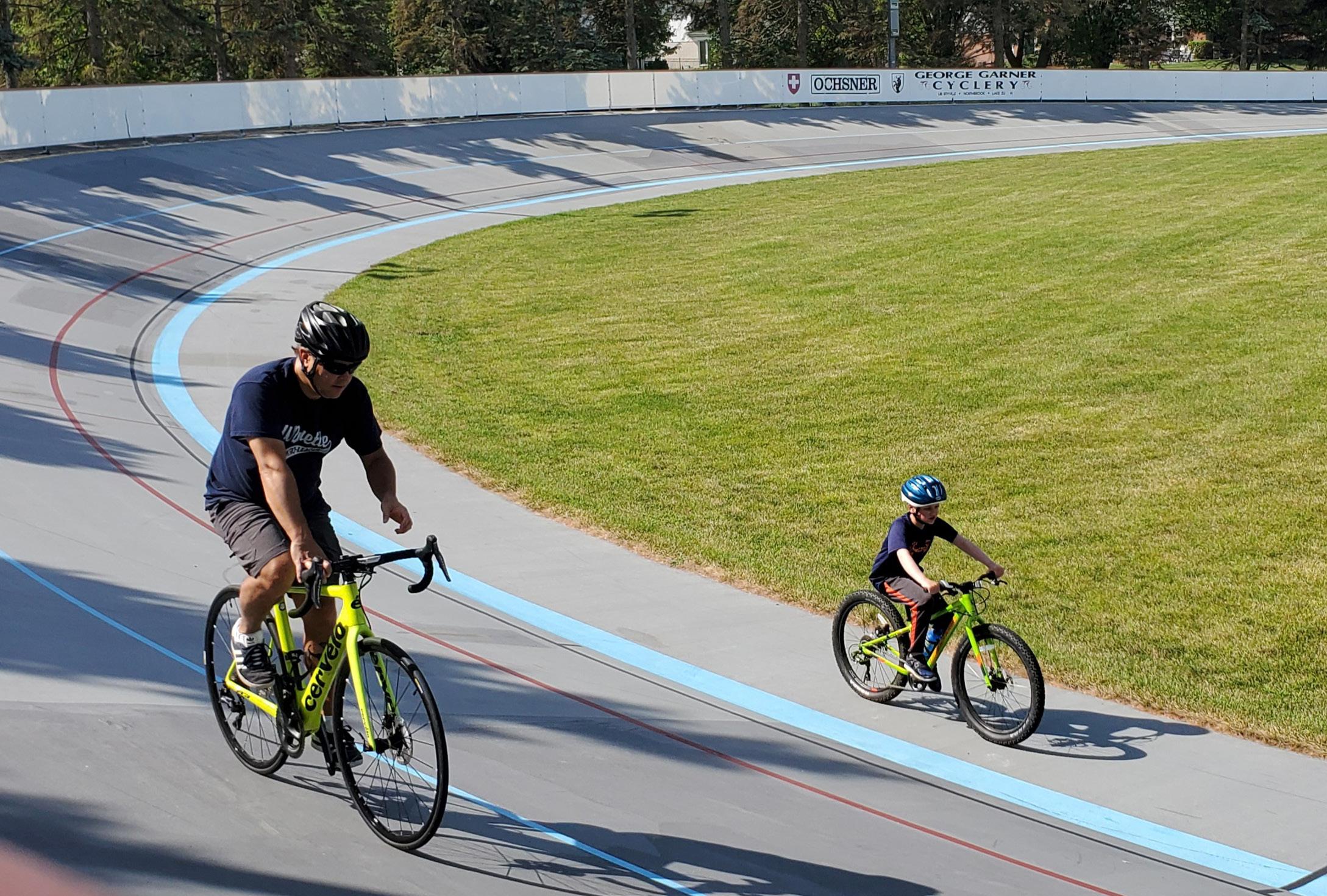 Take to the track on an official quarter-mile banked cycling track with lights for evening riding An indoor space is also available for an additional rental fee .