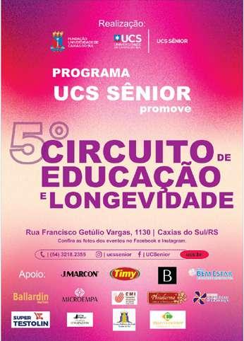 Palestras, Shows, viagens, cinema, dia da longevidade, piquenique cultural Várias datas em outubro Universidade de Caxias do Sul Informações: (54) 3218.2355 FB UCSenior