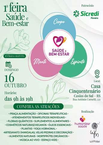1ªFEIRA SAÚDE E BEM-ESTAR Produtos naturais e veganos. Atendimentos terapêuticos. Yoga Hormonal. Música. Espaço Kids. Data: 16 de outubro – das 9h às 19h