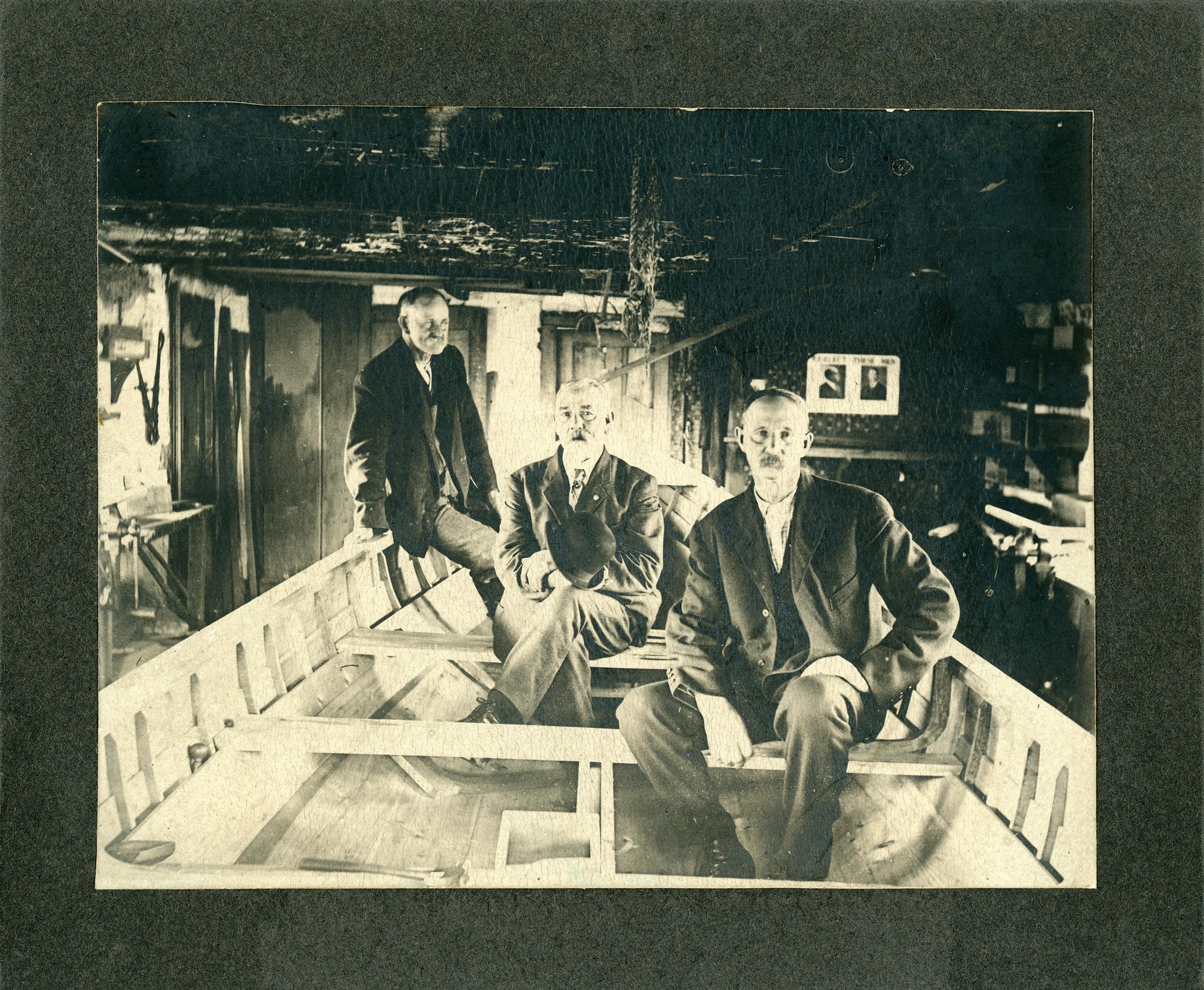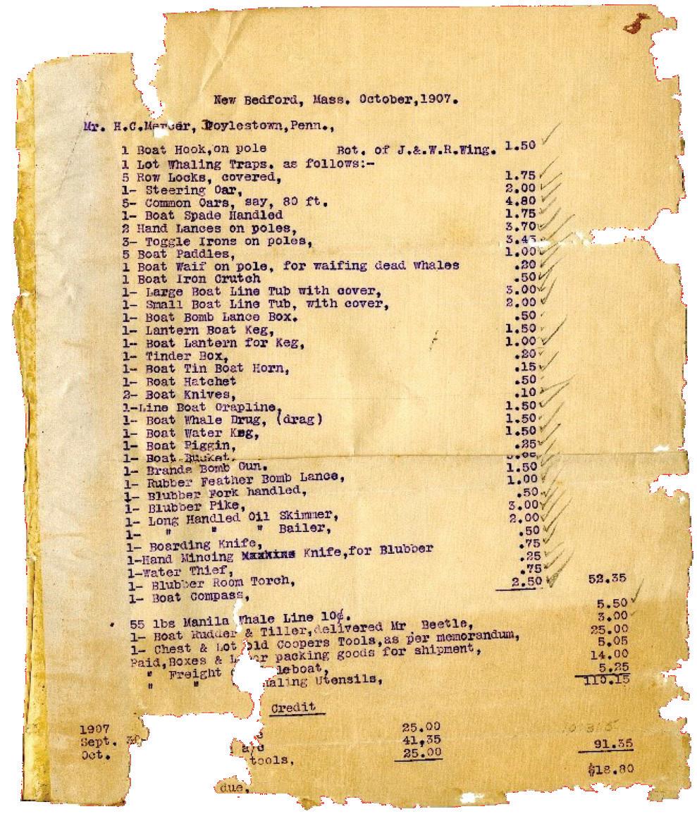 In October 1907, Henry C. Mercer (18561930) acquired a completely outfitted whaleboat (#1945) from the J. & W.R. Wing & Company, New Bedford, Massachusetts. Brothers Joseph Wing (1810-1895) and William R. Wing (1830-1908) of Dartmouth, MA, established the firm in 1849.1 From 1860 to 1910, the company managed one of the largest whaling fleets of the American whaling industry. After Mercer purchased the boat and whaling equipment, he donated the collection to the Bucks County Historical Society. When the new, poured concrete Mercer Museum, in Doylestown, PA was completed in 1916, the boat was suspended from the fourth level of the central court. Much of the whaling equipment that was procured at the time was either placed into the boat itself, along the fourth-level gallery, or into the maritime exhibit in Room 34.