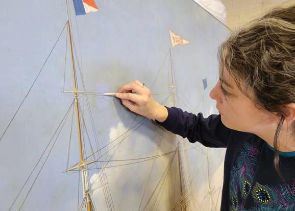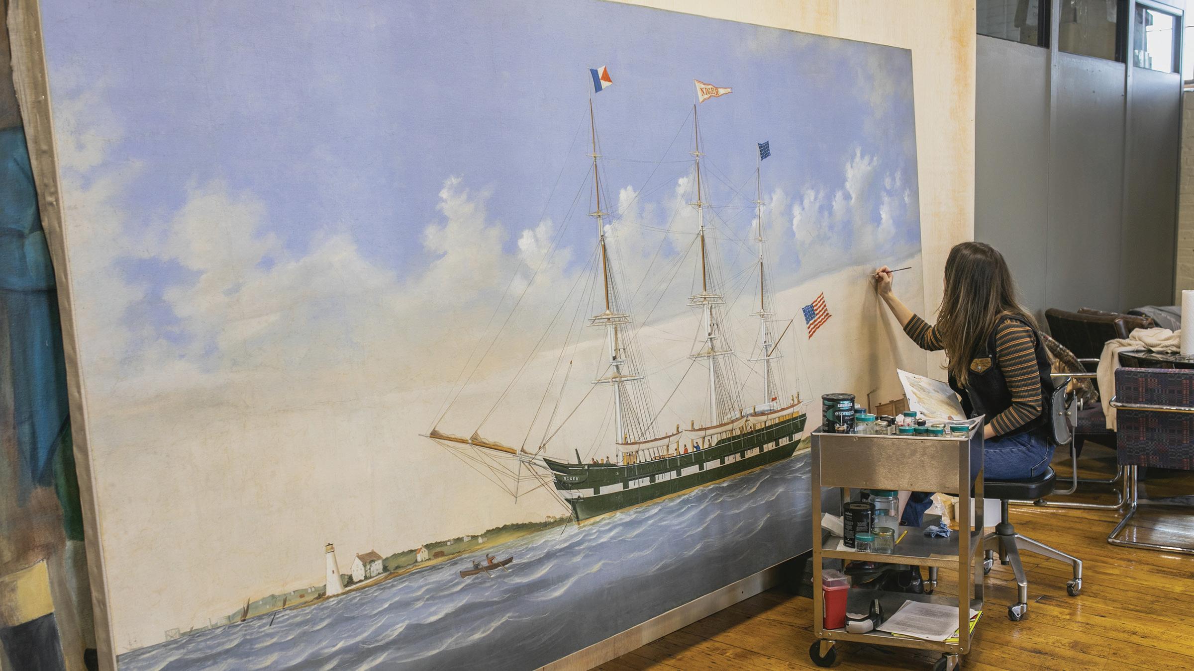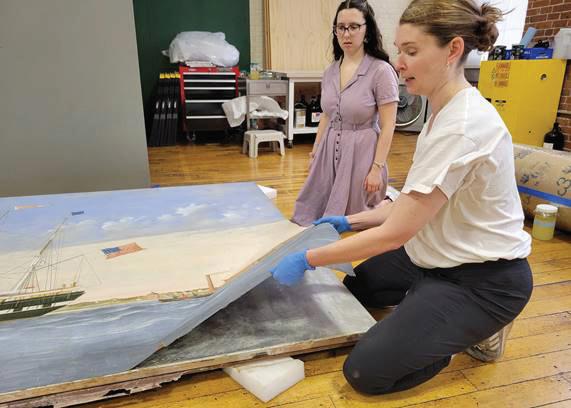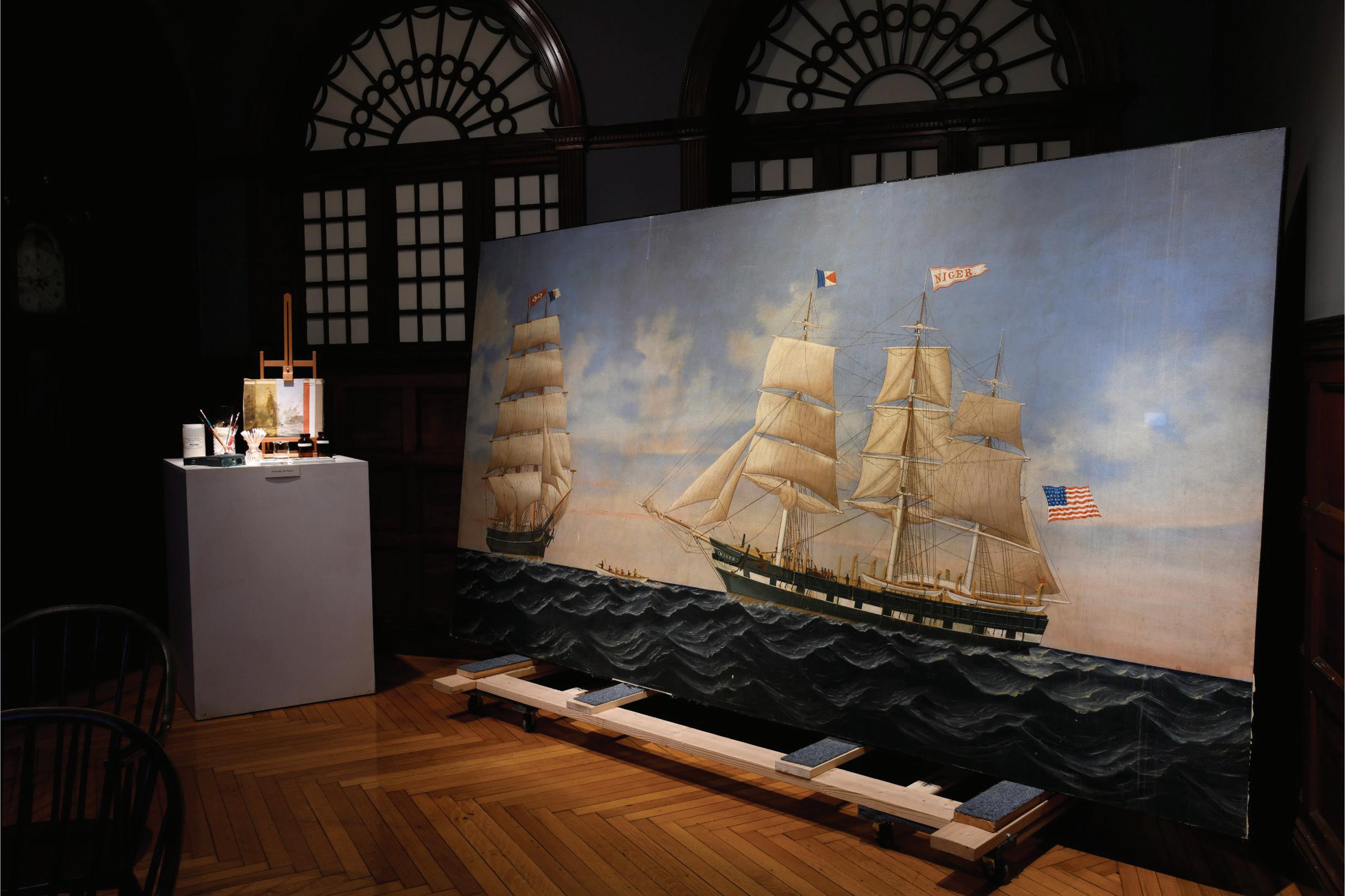 Figure 6. Sailing Day, off Palmer’s Island, New Bedford, Ship NIGER (1878), being conserved at Gianfranco Pocobene Studios in 2023.
