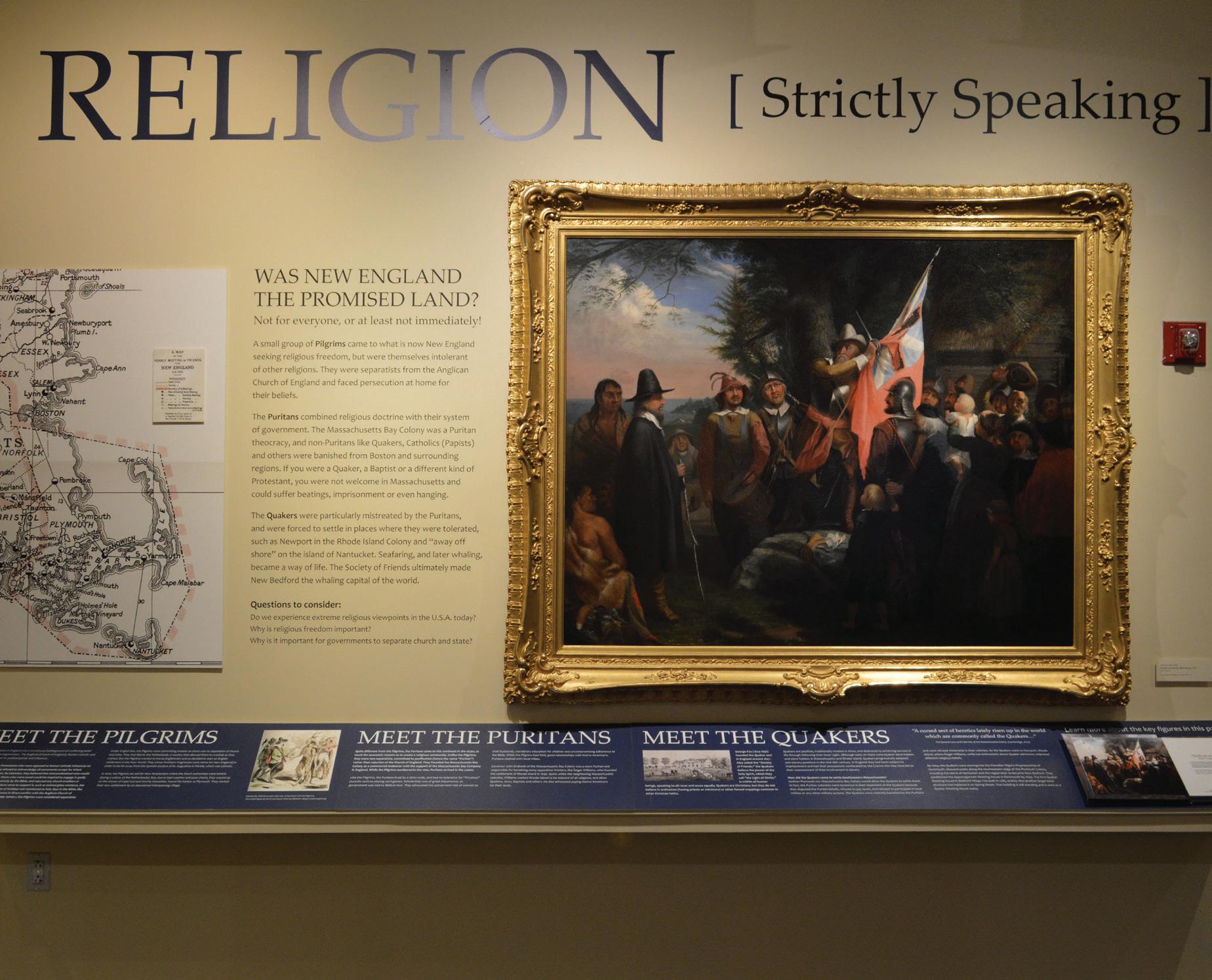 the exhibit, visitors are led back to the life of Gosnold and other settlers. In a section entitled “Meet the Pilgrims, Puritans, and Quakers,” the lives of these groups are documented in detail. In an interactive part of the exhibit, there is a book that allows people to learn more about key figures in a large oil painting by New Bedford Quaker painter William Allen Wall (1801-1885) titled “Endicott and the Red Cross.” The painting is an interpretation of the Nathaniel Hawthorne short story by the same name that appeared in his collection of short stories, Twice-Told Tales (Boston, 1837). The painting shows historical figures like Massachusetts governor John Endicott (c. before 1600-1665) and Rhode Island colony founder Roger Williams (c. 1603-1683), along with a supportive crowd of onlookers and a couple of Native American men. The painting depicts Puritan zealot John Endicott cutting the cross out of the English flag in vehement protest to his perception of the influence of the papacy in the court of Charles I and its subsequent influence upon the Separatist colony in Massachusetts.2 This painting (and its interpretive booklet) demonstrates the relationship between Native Americans of the region and settlers, as well as the relationship between the settlers themselves. Looking at the painting, Endicott and his followers are the primary focus. The Native Americans in the painting are off to the side behind the figure of Roger Williams.